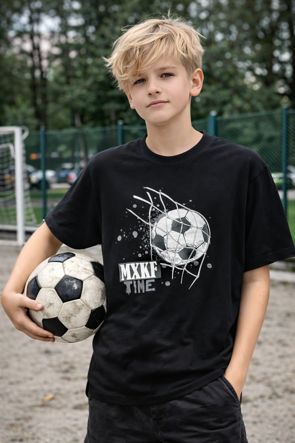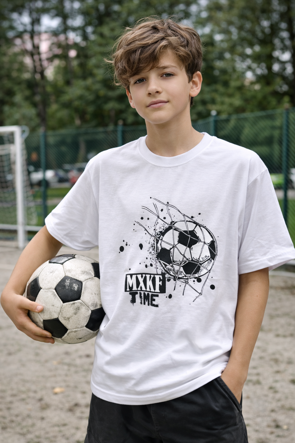 Modernus dizainas su „MXKF TIME“ užrašu ir futbolo motyvu suteikia išskirtinumo, o universalios spalvos (juoda ir balta) leidžia lengvai derinti prie džinsų, šortų ar sportinių kelnių. Tai marškinėliai, kurie tiks tiek kasdienai, tiek žaidimams lauke ar treniruotėms.